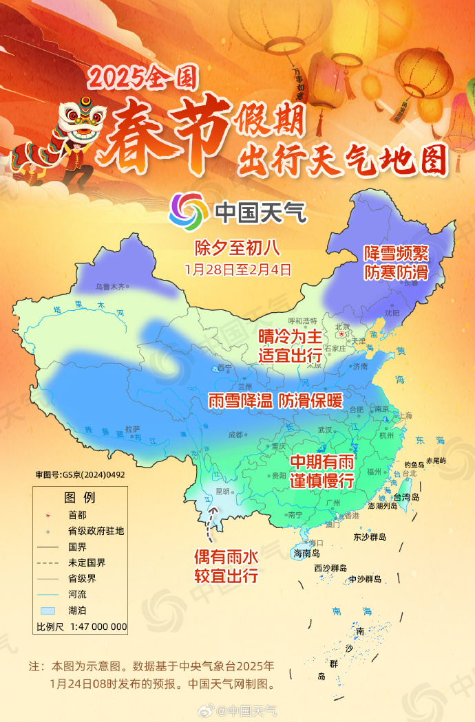 春节假日期间,西北、华北等地气温偏低;除夕至初一,东北地区有降雪;初三至初五,西北地区东南部、黄淮及南方地区有一次雨雪天气过程。此外,除夕至初一,西北、华北大部、黄淮、江汉、江淮、江南、华南大部为晴到少云天气。
