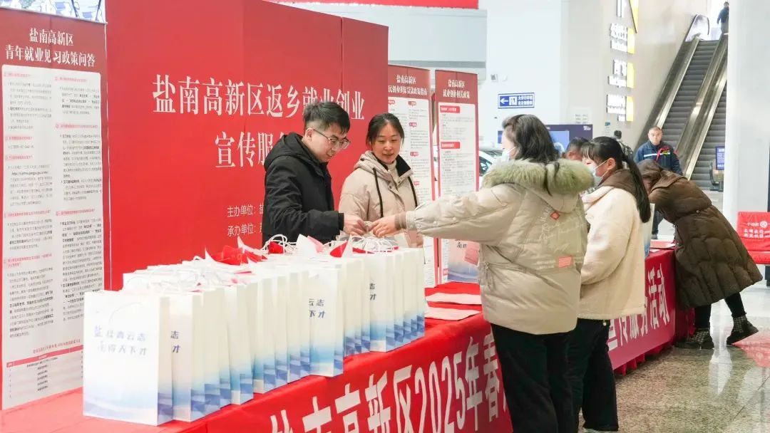 近日,盐南高新区在高铁站出站广场开展新春招聘就业政策宣讲活动,为广大返乡人带来“家门口”的就业信息。