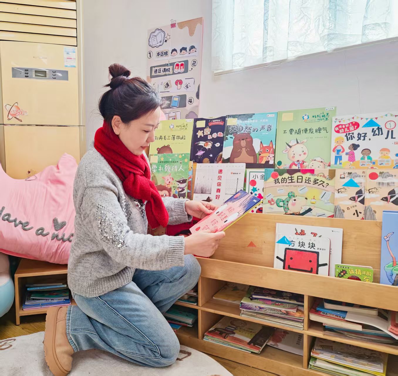 走进教室,张丽拿起工具,细致地清扫着每一个角落,不一会儿,教室窗明几净,为孩子们营造出干净整洁的活动空间。随后,她与同事一起,将教室装点得焕然一新。墙面上,贴满了孩子们亲手创作的手工作品,色彩缤纷,处处彰显着童趣与温馨;探索区里,各种新奇的玩具错落有致地摆放着,仿佛在向孩子们招手,邀请他们来一场奇妙的探索之旅;阅读角也被布置得格外舒适,柔软的坐垫、温馨的灯光,还有一本本精美的绘本,营造出书香阅读的浓厚氛围。