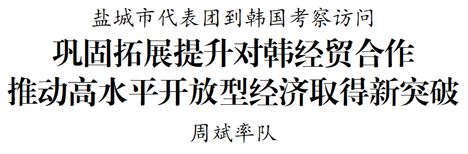 2月10日至14日,市委书记周斌率盐城市代表团到韩国考察访问,深入学习贯彻习近平总书记重要讲话重要指示精神,贯彻落实省委、省政府“一中心一基地一枢纽”建设部署要求,巩固拓展提升对韩友好交往和经贸合作,推动高水平开放型经济取得新突破。