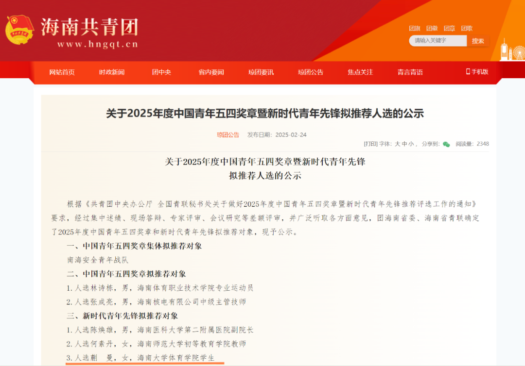日前,共青团海南省委、海南省青联发布《2025年度中国青年五四奖章暨新时代青年先锋拟推荐人选公示》。其中,我市乒乓球运动员、就读于海南大学体育学院的蒯曼,凭借在体育领域的出色表现,入选“新时代青年先锋”拟推荐对象。