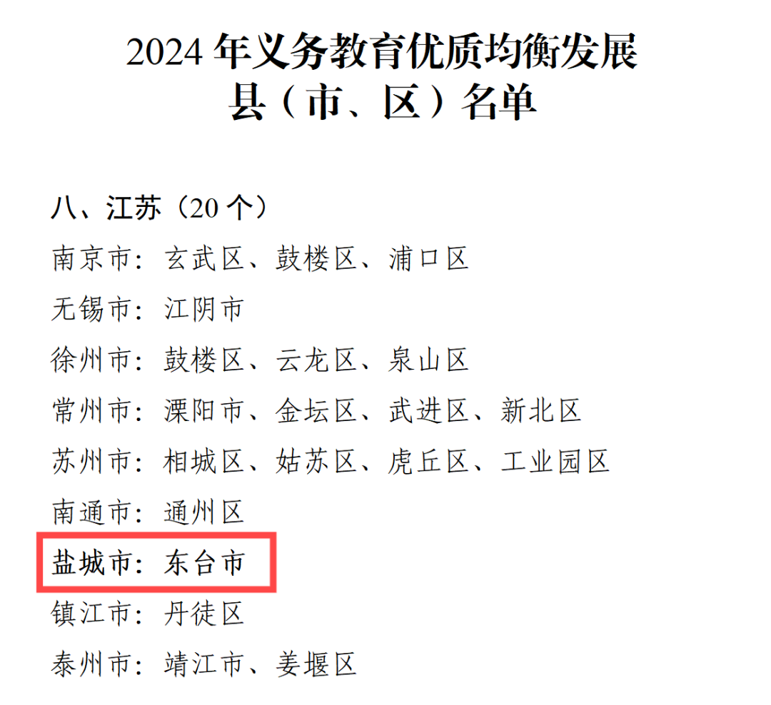 近日,教育部印发通知,公布2024年义务教育优质均衡发展县(市、区)名单,其中,东台市成功入选。