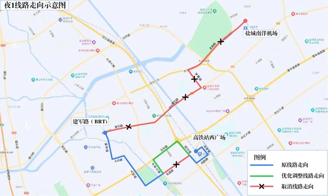 为进一步优化公交线网布局,提升整体运营效能,更好的方便市民出行,盐城公交即日起优化夜1、夜2线,执行准点公交模式,并延长B3线运营时间至21:00,具体如下: