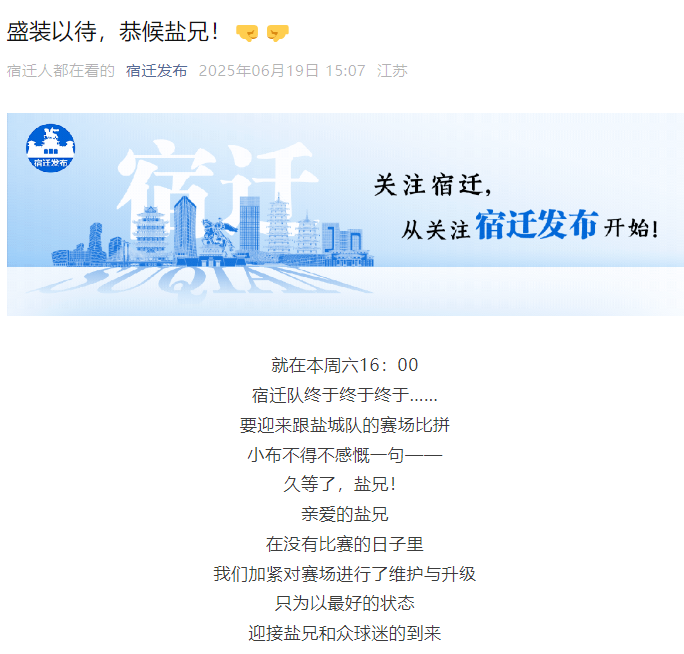 会长恰恰透露,本周将组织6辆大巴远征宿迁。“苏超盐城队代表盐城,我们义无反顾支持!”