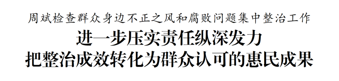 10月9日,市委书记周斌以“四不两直”方式,检查群众身边不正之风和腐败问题集中整治工作。他强调,要深入学习贯彻习近平总书记关于党的自我革命的重要思想,进一步压实责任、传导压力,推动全面从严治党向基层延伸、集中整治向纵深发力,把整治成效转化为群众真正受益、可感可及的惠民成果。