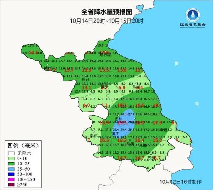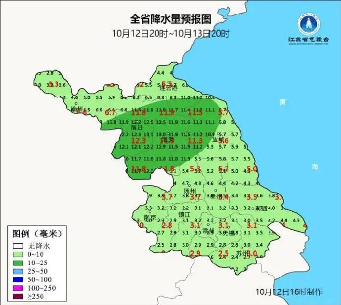 10月12日20时至10月13日20时,沿淮和淮北地区阴有阵雨,雨量小到中等,其他地区多云转阴有阵雨或雷雨。