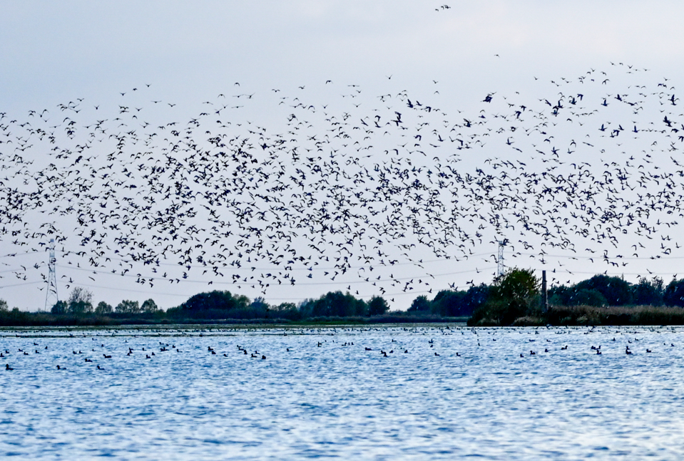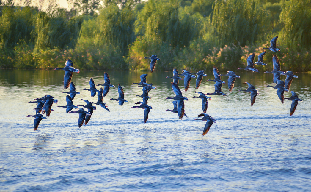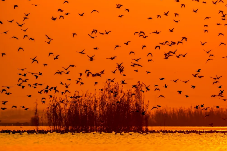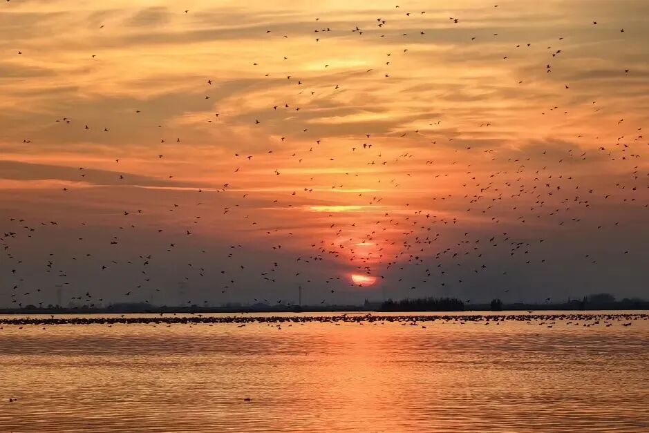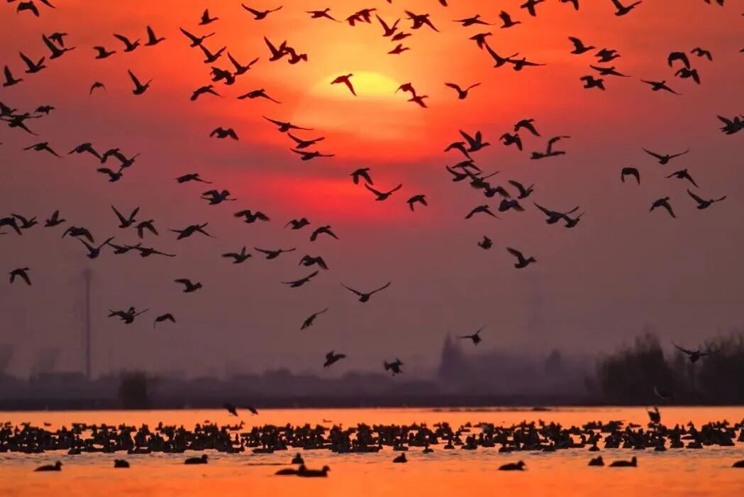 唯余天地、湖水与群鸟共舞的诗意画卷
