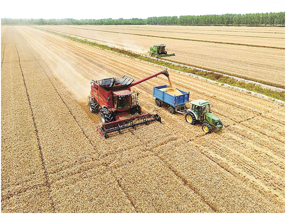 在阜宁县陈良镇新涂村水稻制种稻田里,稻穗颗粒饱满,伴随着机器的轰鸣声,4台收割机正穿梭于田间作业,切割、脱粒、粉碎稻秆等收割工序一气呵成,几个来回,整片稻田便已收割完毕。满载稻谷的收割机驶向田头,通过伸缩卸粮筒将稻谷精准输送至运粮车中。