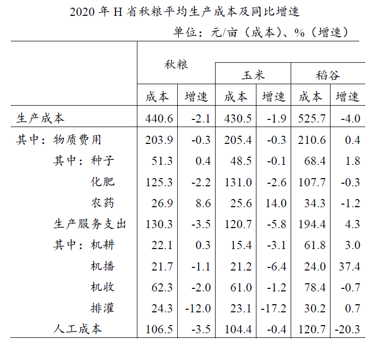 2020年,H省秋粮玉米和稻谷的市场平均交易价格分别为2.34元/公斤和2.74元/公斤,分别比上年上涨28.6%和8.7%。按此价格测算,2020年全省农户种植玉米、稻谷扣除成本前的产值分别为957.1元/亩、1520.7元/亩,分别比上年增长33.4%、8.9%。