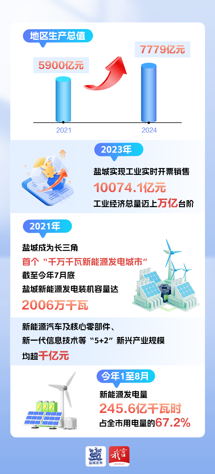 “十四五”收官之际,黄海之滨盐城,以全方位的精彩跨越,交出铿锵答卷:地区生产总值从2021年的5900亿元,跃升至2024年的7779亿元;产业结构从“一车”独大,发展到新能源汽车及核心零部件、新一代信息技术等“5+2”新兴产业规模均超千亿元;城市能级从一座沿海节点城市,跃升为辐射内陆、联通全球的长三角北翼枢纽。