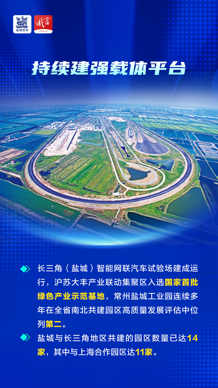 园区共建,打造合作新样板。园区是承接产业转移和区域合作的主阵地。如今,盐城与长三角地区共建的园区数量已达14家,其中与上海合作的园区高达11家,实现了县域全覆盖。沪苏大丰产业联动集聚区入选国家首批绿色产业示范基地,常州盐城工业园在全省南北共建园区评估中稳居前列。特别是国内首个大型综合封闭式智能网联汽车试验场——长三角(盐城)智能网联汽车试验场的建成运行,不仅填补了国内空白,更彰显了盐城在细分领域打造长三角共享平台的决心。