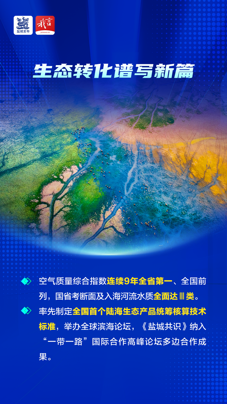 生态转化,绘就“两山”画卷。盐城坚定不移走生态优先、绿色发展之路。2024年,全市PM2.5平均浓度29微克/立方米,环境空气质量优良天数比率86.6%、位列全省第一。同时,国省考断面水质优良率保持100%。在守护好绿水青山的同时,盐城更致力于将“绿水青山”转化为“金山银山”。它拥有“世界自然遗产”和“国际湿地城市”两张国际名片。至2024年,全市记录到生物物种4759种,观测到丹顶鹤547只,为近9年来数量最多。盐城率先制定全国首个陆海生态产品统筹核算技术标准,让“生态有价”从理念走向实践。成功举办全球滨海论坛,《盐城共识》更是纳入了“一带一路”国际合作高峰论坛多边合作成果,盐城的生态智慧正在走向世界。