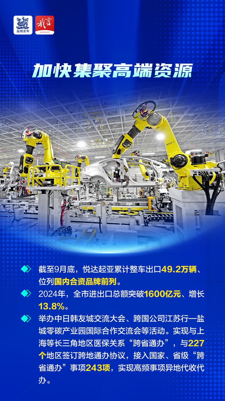 开放共赢,汇聚全球资源。盐城的“朋友圈”不断扩大。截至9月底,悦达起亚累计整车出口49.2万辆。2024年,全市进出口总额突破1600亿元,增长13.8%。通过举办中日韩友城交流大会、跨国公司江苏行等国际活动,盐城吸引了法国道达尔、芬兰挪世航力等跨国公司持续加码投资。