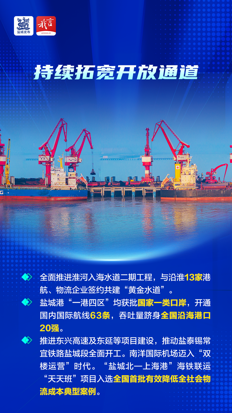 枢纽能级,贯通发展动脉。交通是现代化建设的开路先锋。“十五五”期间,盐城将围绕建设东部沿海区域性综合交通枢纽,全力提升盐城港能级,加快实施滨海港区20万吨级、大丰港区10万吨级等深水航道工程;建成盐泰锡常宜铁路,规划建设沿海高铁(青岛至盐城段),实现时速350公里高铁南北贯通;提升南洋机场飞行区等级至4E级,打造辐射国内、面向东亚的空中门户。目前,盐城港“一港四区”全部为国家一类口岸,开通航线63条,吞吐量已跻身全国沿海港口20强。特别值得一提的是,“盐城北—上海港”海铁联运“天天班”项目入选全国首批有效降低全社会物流成本典型案例,成为区域协同降本增效的典范。