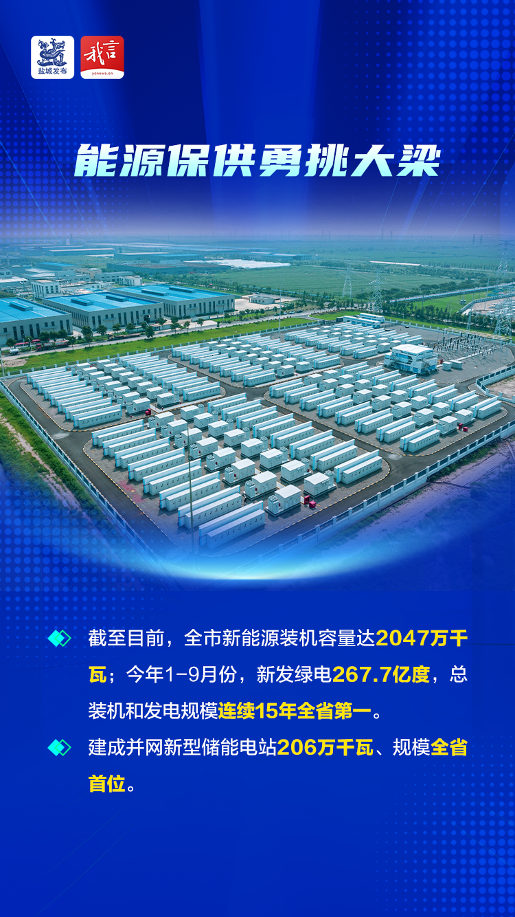 能源崛起,担当保供重任。盐城拥有得天独厚的“风光”资源。截至目前,全市新能源装机容量已达2047万千瓦;今年1至9月新发绿电267.7亿度,总装机和发电规模连续15年位居全省第一。这不仅是盐城的绿色财富,更是服务长三角的底气。滨海县正凭借其丰富的“风光火气氢”资源和完善的产业链,全力打造长三角最大的能源保供基地,利用滨海港优越的区位优势,高起点、高标准建设“风光火气氢储一体化”“源网荷储一体化”多能互补的综合能源保供基地,打造全国最大的清洁煤电基地、最大的LNG储备基地、最大的综合能源承载基地,未来将成为辐射区域的“绿色能量心脏”。