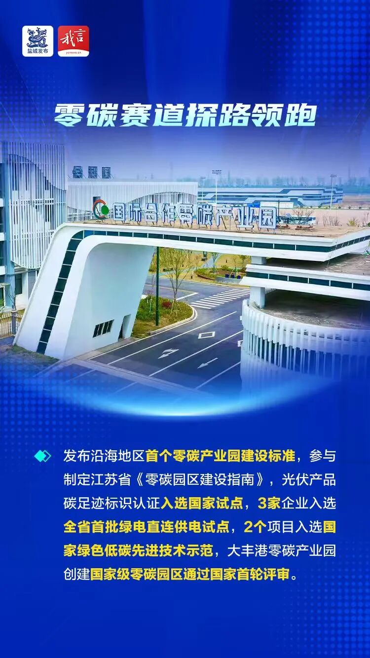 零碳引领,勇立时代潮头。以入选全国首批碳达峰试点城市为契机,盐城在零碳新赛道上全力奔跑。大丰港零碳产业园创成国家级绿色低碳先进技术示范项目,并通过国家级零碳园区首轮评审。园区在国内率先构建了基于国网架构的“源网荷储”一体化新型电力系统,实现了“绿电物理可溯源”,并获得国际权威认证机构BSI的审定认可。盐城还积极参与标准制定,发布了沿海地区首个零碳产业园建设标准,参与制定江苏省《零碳园区建设指南》,光伏产品碳足迹标识认证入选国家试点,从“实践者”向“规则制定者”迈进。