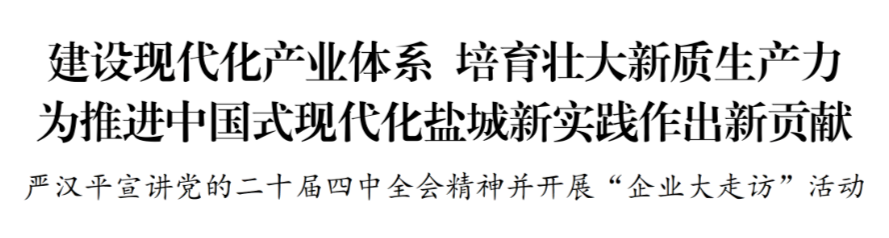 11月1日,市长严汉平到企业宣讲党的二十届四中全会精神并开展“企业大走访”活动。他强调,要深入学习贯彻习近平总书记重要讲话和党的二十届四中全会精神,以推动高质量发展为主题,加快构建现代化产业体系,积极发展新质生产力,深入企业纾困解难,用实际行动推动全会决策部署落地落实,为推进中国式现代化盐城新实践作出新贡献。