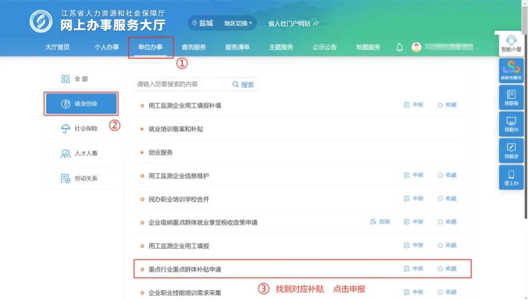 中小微企业线上申请,登录江苏人社网上办事服务大厅,点击“单位办事—就业创业—重点行业重点群体补贴申请—申报”。