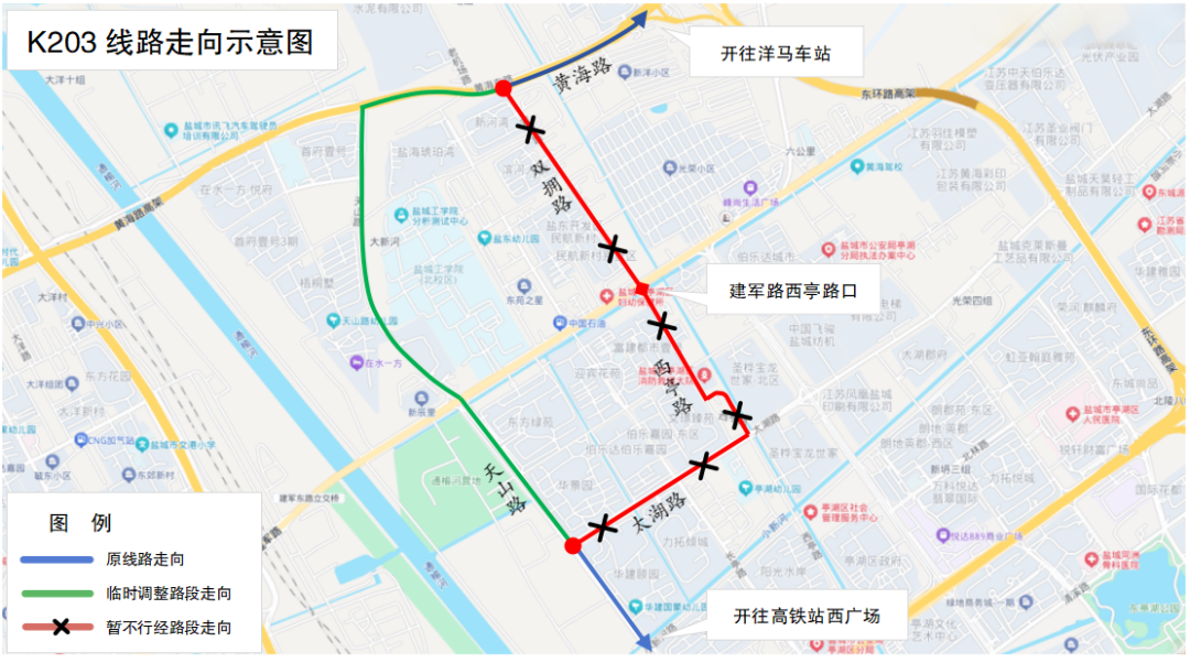 因建军路西亭路口道路临时封闭施工,即日起,公交K203路临时改道行驶,具体如下: