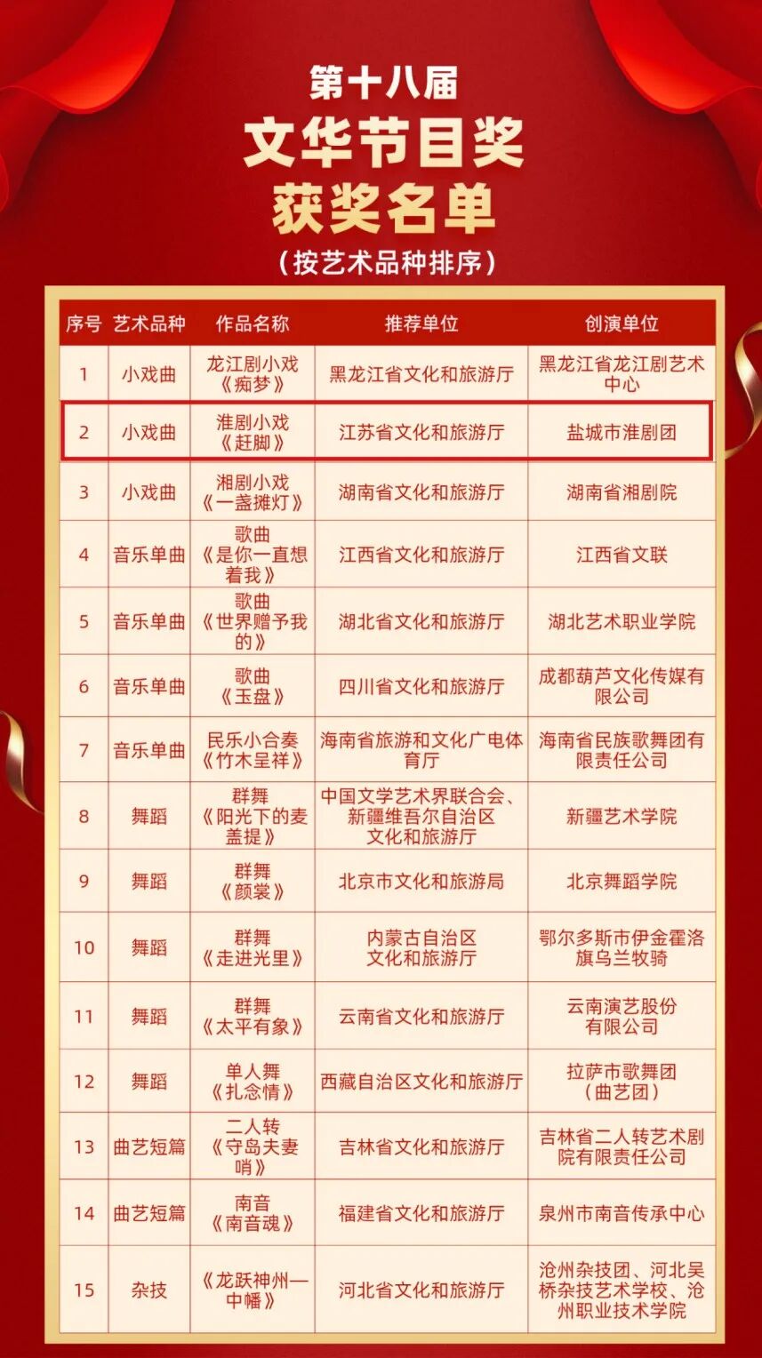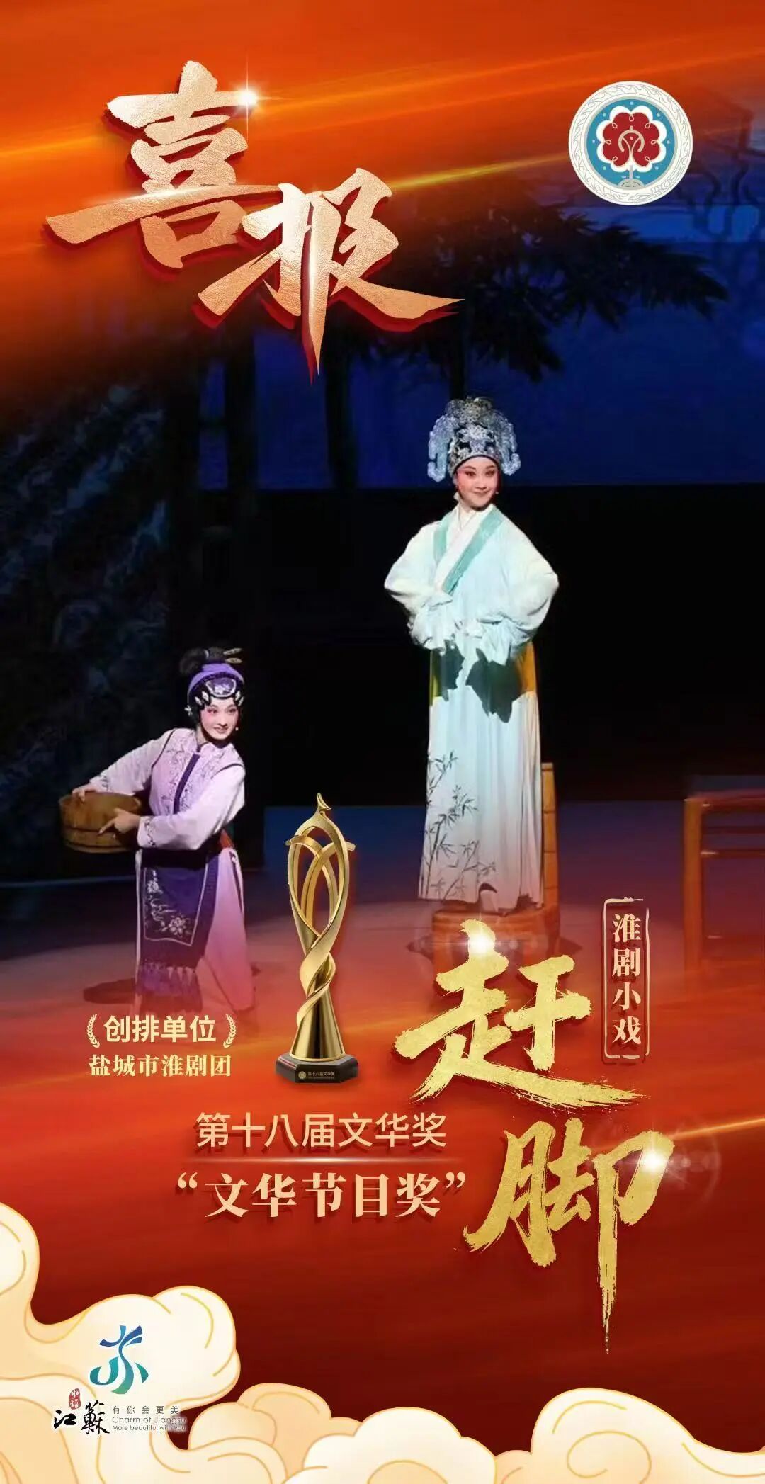 2024年,淮海小戏《方向盘》(响水)荣获首届全国小戏小品展演优秀作品奖;小淮剧《抠婶赶猪》(射阳)在“中华颂”第十四届全国小戏小品曲艺大展上获优秀编剧、最佳剧目、优秀演员奖。