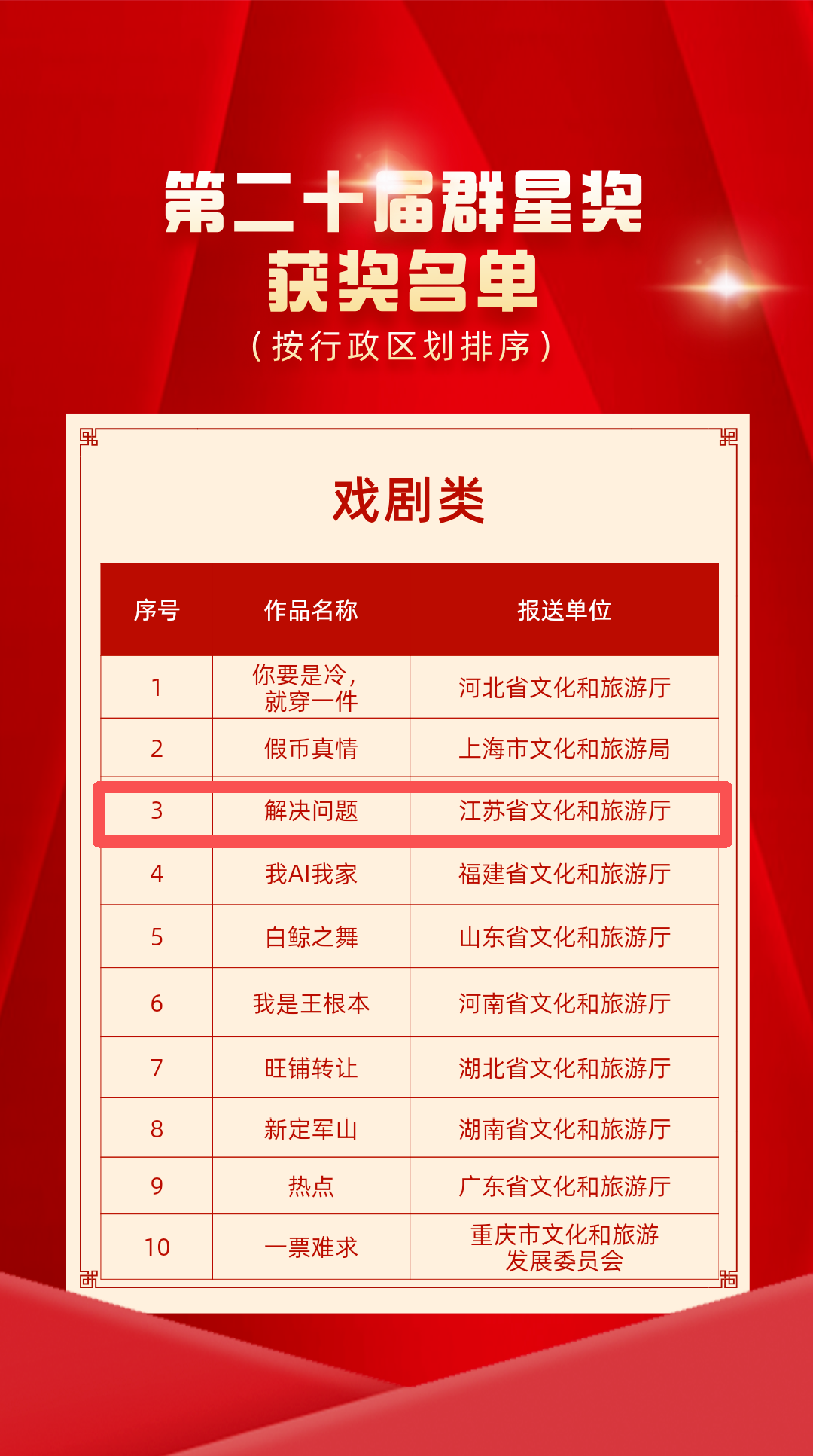 该剧在参加群星奖评选时“《解决问题》经过三年多的精心打磨,一路走来,实属不易,这样扎根生活的创作,不仅是盐城地域文化的生动表达,更彰显了盐城群众文化作品‘以情动人、以美育人’的初心。”市文化馆馆长杨莺说。