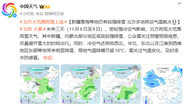 11月6日至8日,受较强冷空气影响,北方将现大范围雨雪天气,其中新疆、内蒙古部分地区或现较强降雪,公众需关注预警预报信息,尽量避开雪大的时段出行。