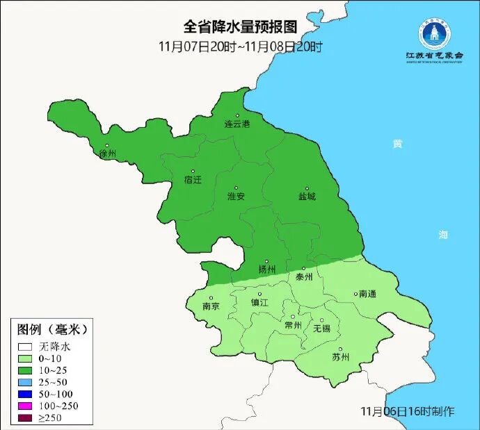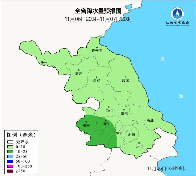 11月6日20时至11月7日20时,全省阴有小雨,其中本省西南部地区雨量中等。最高温度:本省东南部地区20~21℃,本省西北部地区17℃左右,其他地区18~19℃;最低温度:淮北地区12~13℃,其他地区15℃左右。全省偏东风4-5级阵风6级。