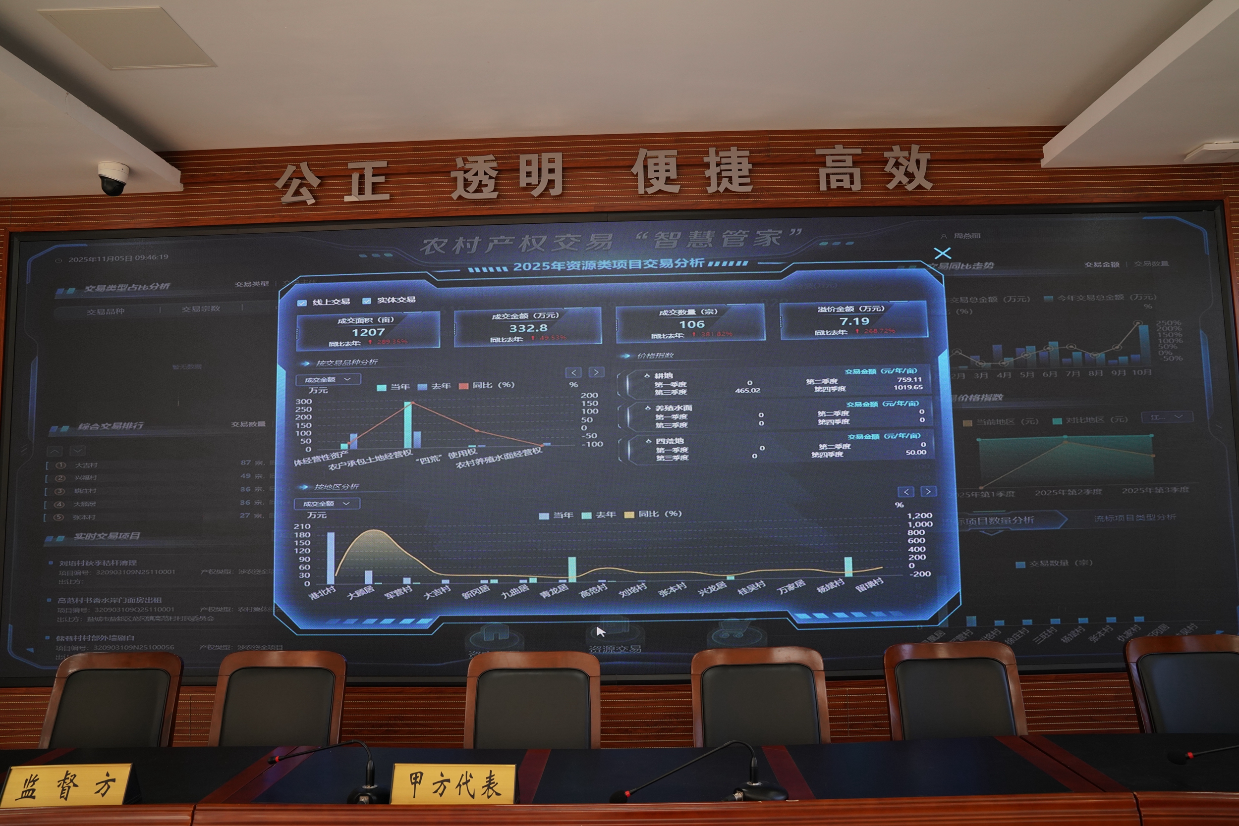 “数智管家”通过大数据分析,支持区、镇、村三级查看农村产权交易情况,直观展示各类资产资源的成交金额、笔数排名、交易活跃度,还能一键追溯历史交易单价,实现跨时段、跨区域快速比价。