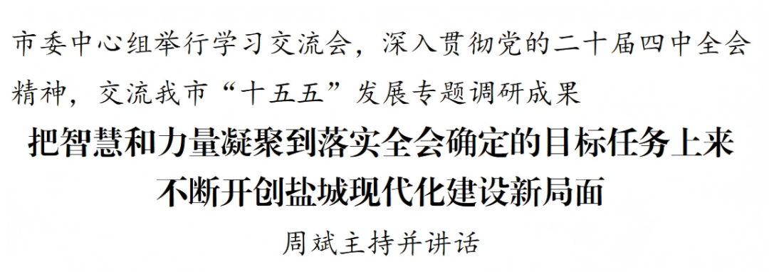 11月10日,市委中心组举行学习交流会,深入贯彻党的二十届四中全会精神,交流我市“十五五”发展专题调研成果,把智慧和力量凝聚到落实全会确定的目标任务上来,不断开创盐城现代化建设新局面。市委书记周斌主持并讲话。