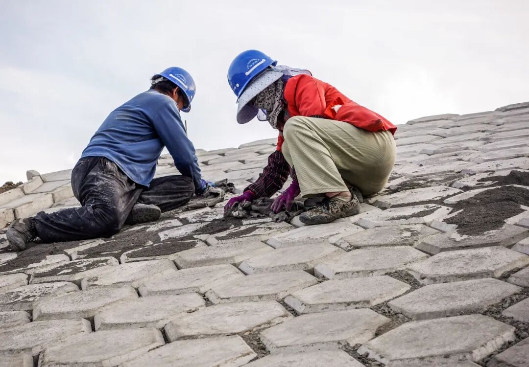 项目在应对多重挑战的同时,也将绿色发展理念贯穿设计与施工全程,打造多项环保亮点。项目在全省首创全输送、无装载环保型高速混凝土供应中心,粗细集料全程输送带配送,车间无装载机且作业无人化,混凝土运输车集中清洗,实现砂石分离循环利用。“三场”建设创新租用闲置厂房,缩短周期的同时节约土地781亩,减少土地复垦对生态影响。钻桩施工引进先进设备处理废弃泥浆,实现循环再利用;践行“边建边绿”,在互通区、施工便道两侧开展绿化种植,同步落实便道洒水降尘等措施,裸土用绿网全覆盖,有效抑制扬尘,全方位保护周边生态。