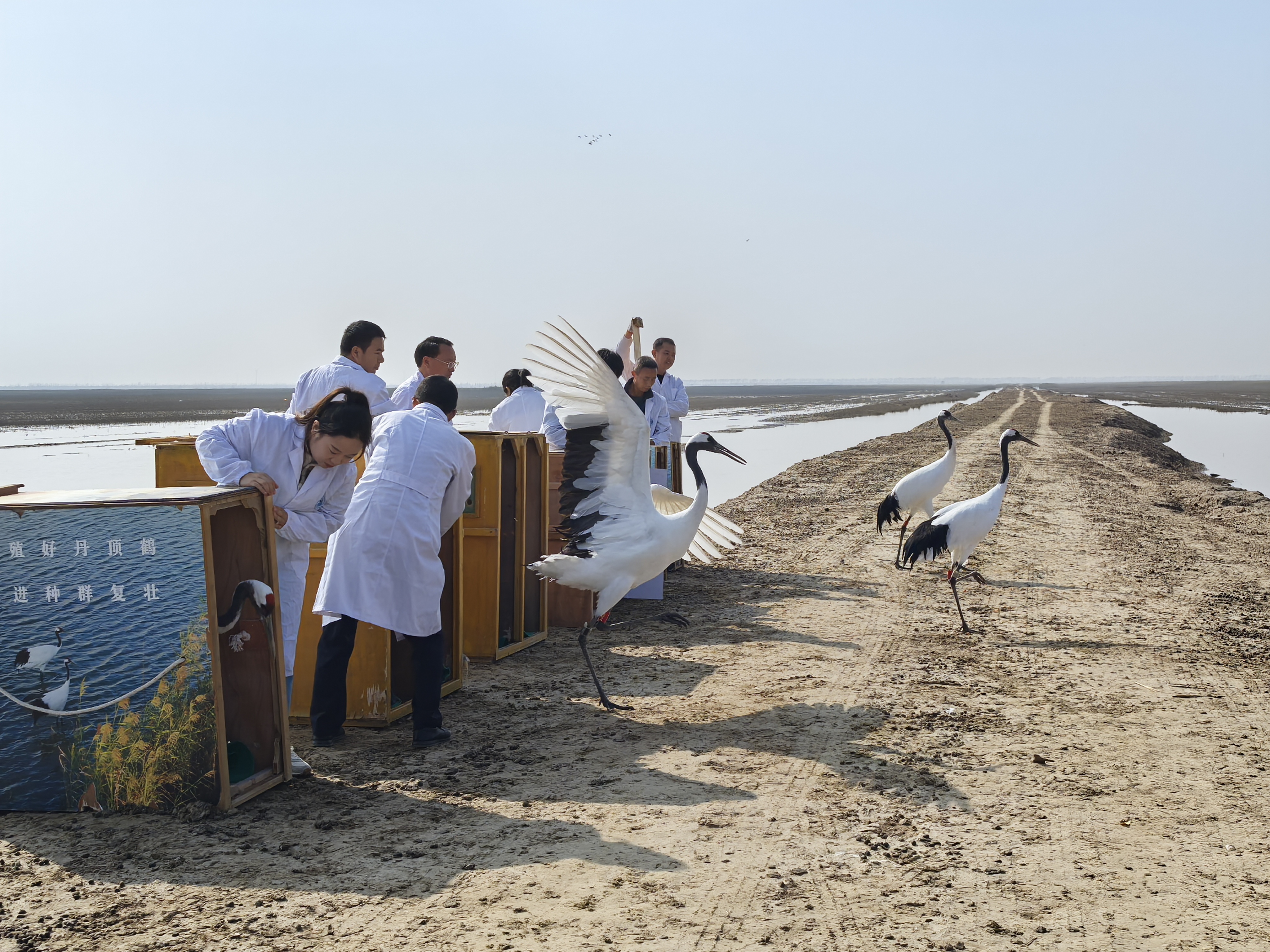 随着运输箱的打开,丹顶鹤轻盈踱出,振翅飞向空中……11月14日上午,江苏盐城湿地珍禽国家级自然保护区10只人工繁育丹顶鹤经过野化训练后,成功放归大自然。