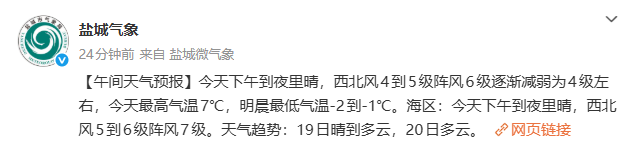 据@盐城气象 消息