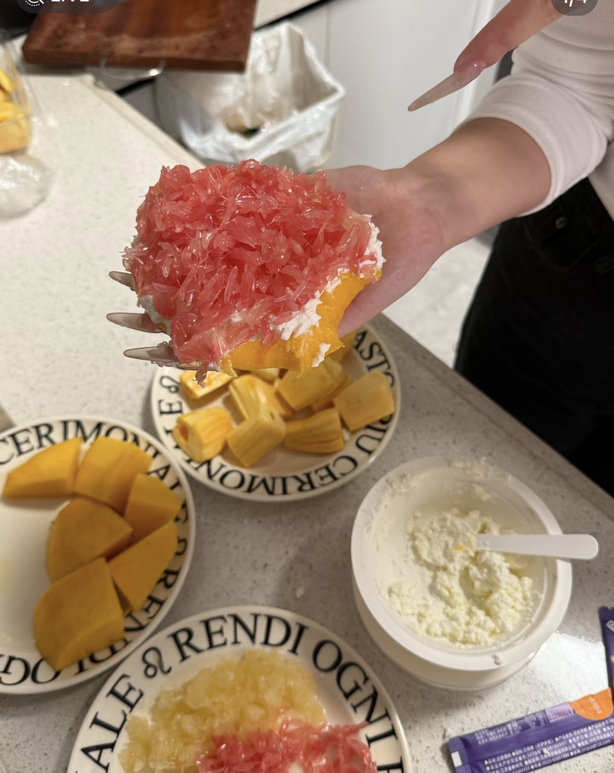 作为美食博主,陈琳详细拆解了材料成本:半个芒果约七八元,酸奶用浓稠一点的约五元,西米和红柚成本不过两三元。“算下来还不到店里一半的价格,果品、奶源还能自己控制,吃起来更安心。”