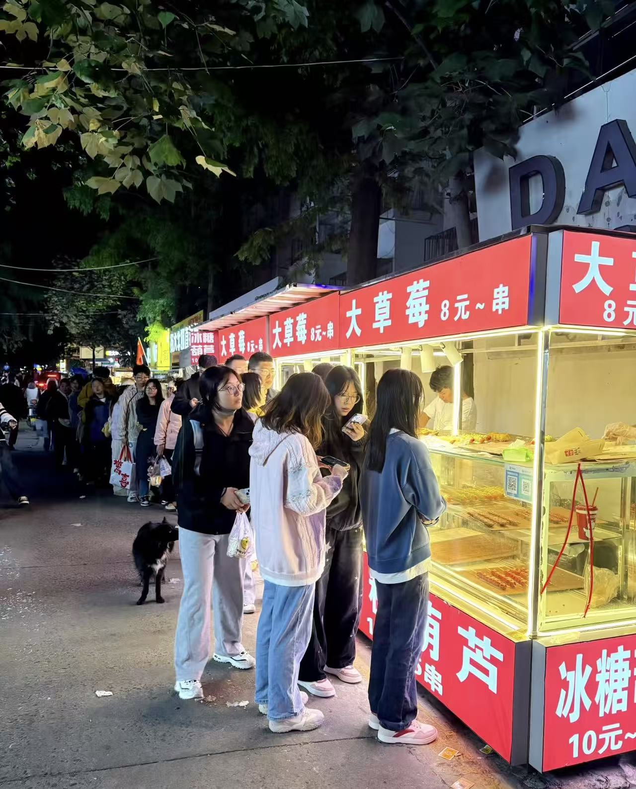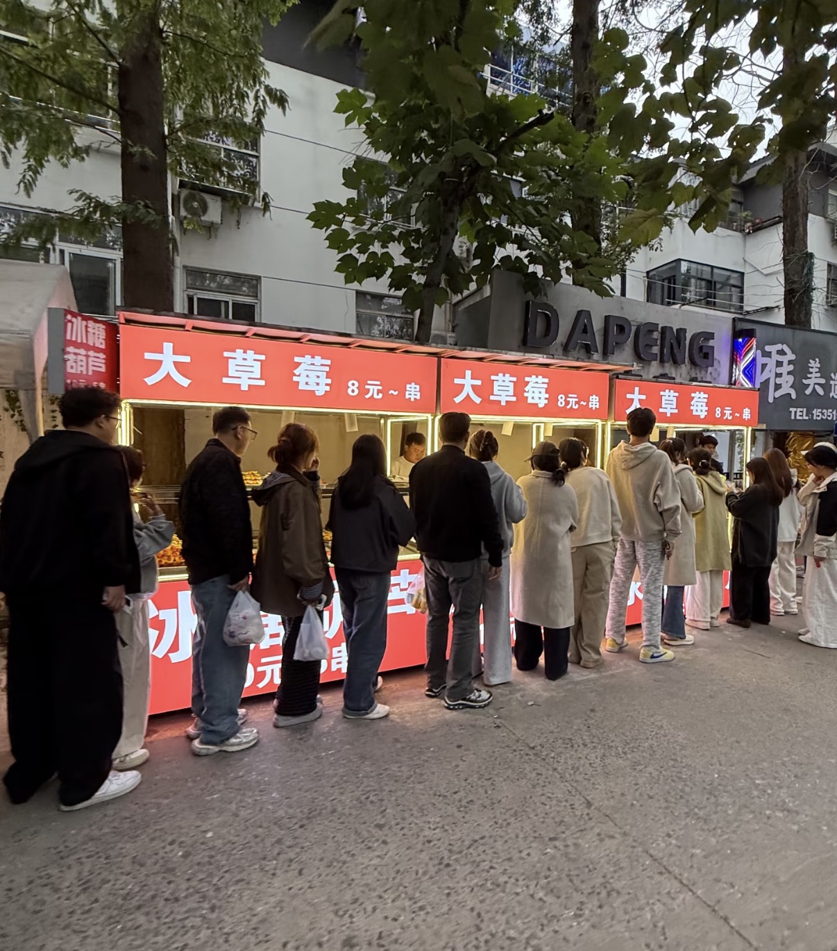 奶皮子糖葫芦似乎是这个冬天的“必吃单品”。在育才路大草莓糖葫芦门店,高峰时段排起长队已成常态,每人还限购两串。尽管天气寒冷,队伍中的大学生小刘依然耐心等待:“我在小红书上刷到好几次了,今天没课特地来打卡。”