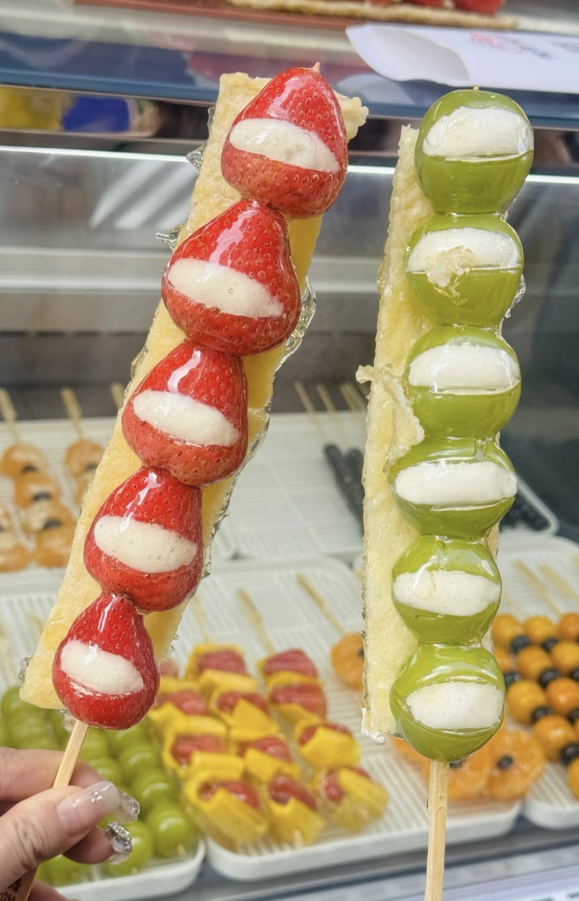 几乎每一位拿到这串“冬日限定”的顾客,都会在店门口停下脚步,举起手机,调整角度,认真记录下这一刻。所谓奶皮子糖葫芦,常见的是在传统糖葫芦外面贴一层奶皮子,更创新的版本则把山楂换成青提、草莓等水果,几乎集齐所有网红食材。