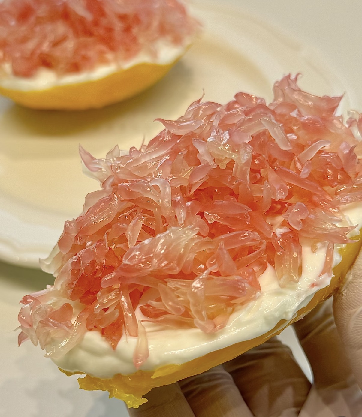 而接棒成为新“顶流”的固体杨枝甘露,则是将经典粤式饮品“固态化”,将芒果切板作基底,涂抹厚厚的干噎酸奶,再撒上柚子果肉和西米,变成可以手持的甜品。