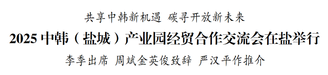 会上推介了盐城投资环境、韩中(新万金)产业园、中韩(盐城)产业园产城融合发展核心区、中韩(盐城)产业园临港配套区。江苏省商务厅、盐城市人民政府、盐城经济技术开发区管委会签订共建驻韩经贸代表处协议,盐城、烟台、惠州三个中韩产业园签订联动机制合作备忘录,一批规模型、外向型、创新型绿色低碳合作项目签约。