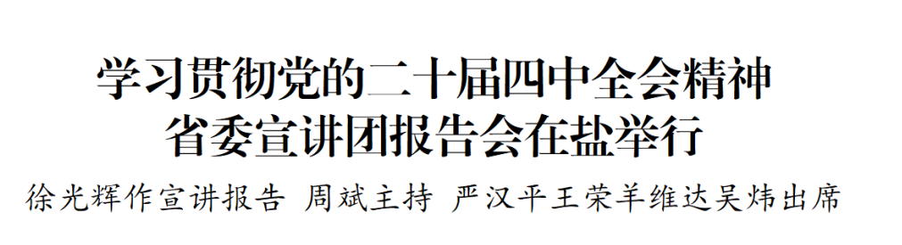 按照省委统一部署,11月21日,学习贯彻党的二十届四中全会精神省委宣讲团报告会在盐举行。省委宣讲团成员、省科技厅党组书记、厅长徐光辉作宣讲报告。市委书记周斌主持并讲话。市委副书记、市长严汉平,市人大常委会主任王荣,市政协主席羊维达,市委副书记吴炜等出席。