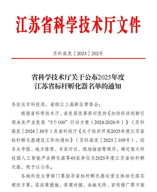 江苏省标杆孵化器是以支撑加速前沿科技成果转化和未来产业培育为目标,以孵化“硬科技”独角兽、瞪羚企业、高新技术企业为主攻方向,着力孵化模式升级和服务效能提升,高效整合高层次专业孵化人才、技术研发服务平台、专业化早期孵化基金等高端创新资源,打造具有专业示范带动强、孵化育成能力突出、有代表性和影响力等特征的高质量创新创业载体。