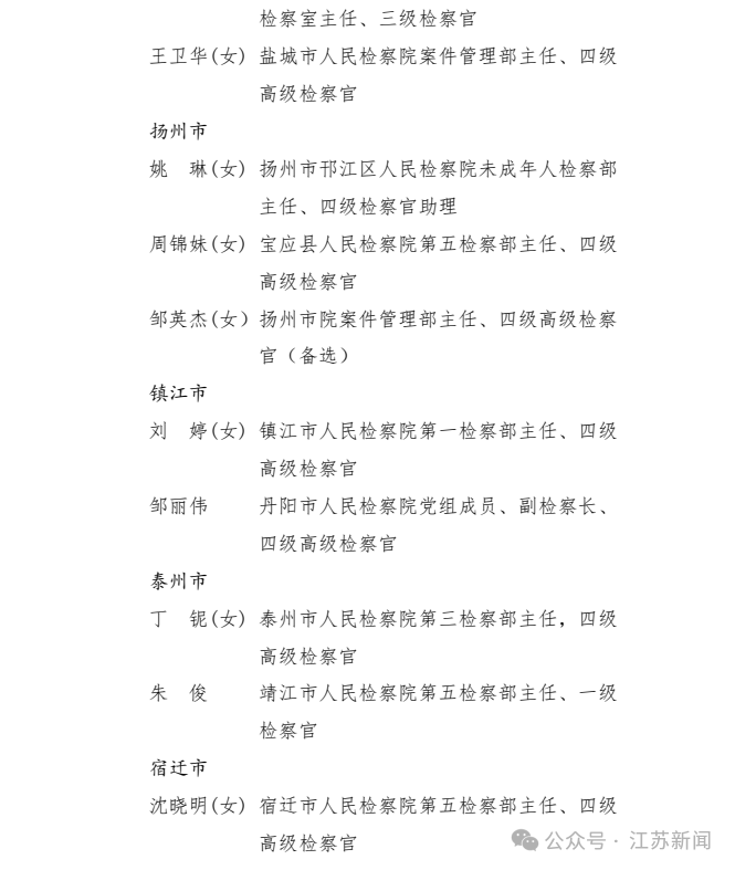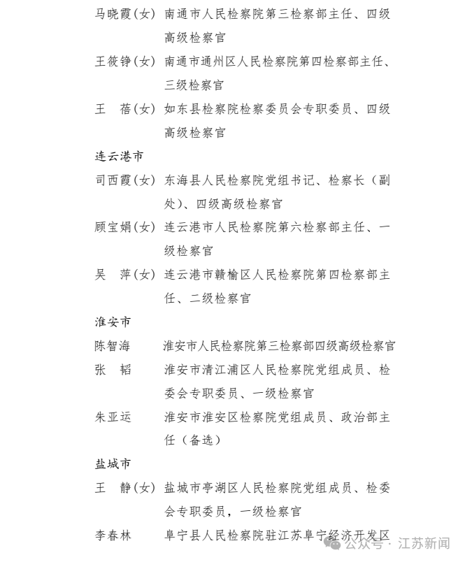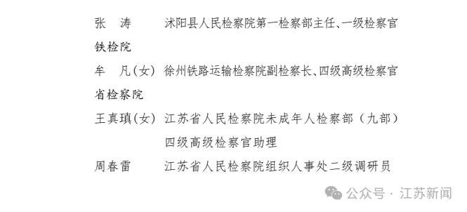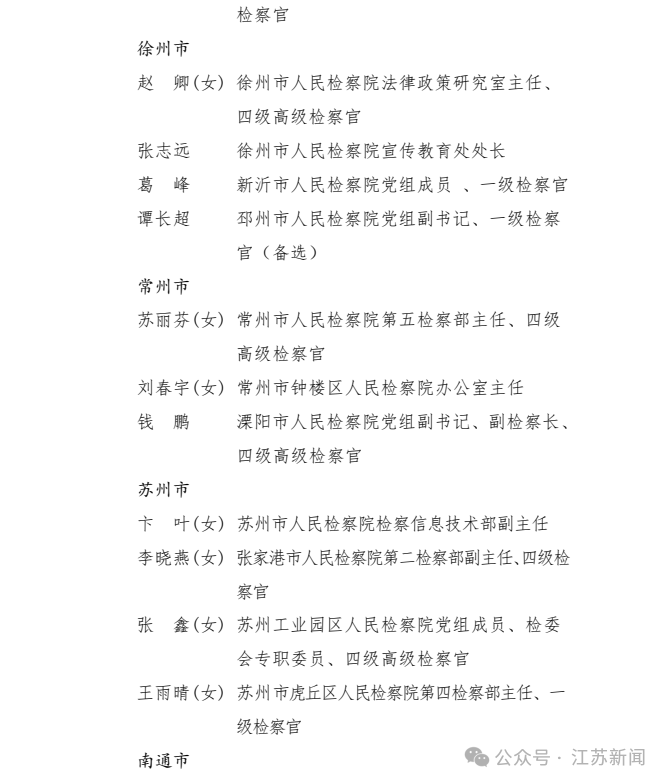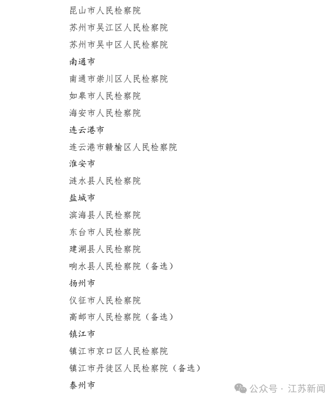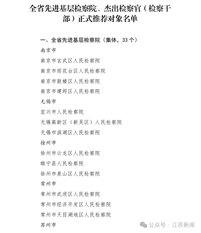 根据江苏省人力资源社会保障厅、省检察院《关于组织开展全省先进基层检察院、杰出检察官评选表彰活动的通知》(苏人社函〔2025〕216号)要求,经自下而上、层层推荐、择优遴选,省先进基层检察院、杰出检察官评比表彰工作组研究确定了33个“全省先进基层检察院”、43名“全省杰出检察官(检察干部)”正式推荐对象。