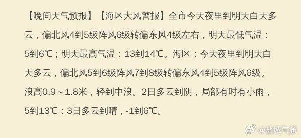 本周2日我市云系较多,局部有弱降水,其余时段以晴或多云天气为主。2日夜间到3日受较强冷空气影响,48小时(2-4日)最低气温降幅可达8~9℃,4日早晨最低气温-4~-3℃,部分地区将出现冰冻。冷空气影响期间,2日夜间至3日全市风力较大,将出现陆上6级,海区8级左右的偏北大风。