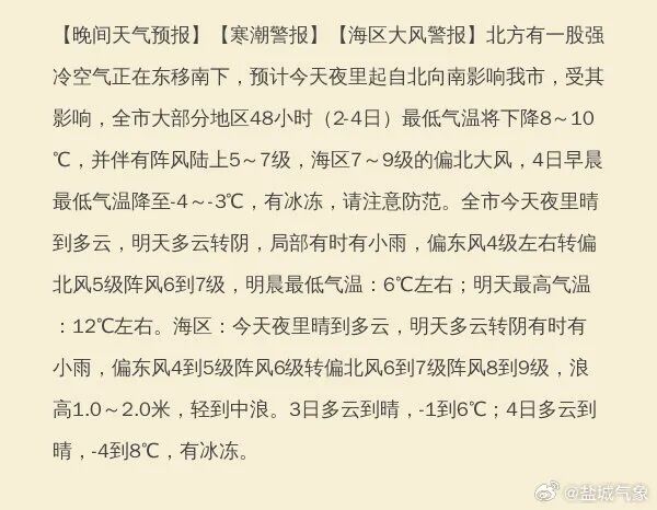 寒潮警报和海区大风警报