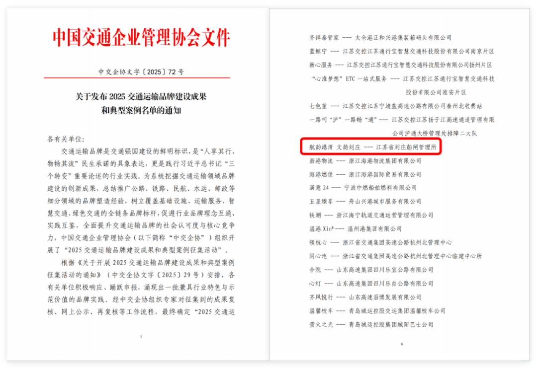 近日,2025交通运输品牌建设成果和典型案例名单发布,盐城港航刘庄船闸凭借其特色鲜明的服务品牌“航韵港湾文韵刘庄”成功入选,成为全国内河航运服务领域又一张亮眼的“金名片”。这一荣誉不仅是对刘庄船闸多年来坚持服务为民、文化赋能、创新发展的充分肯定,也为江苏乃至全国交通窗口单位提升服务质量提供了可借鉴的“刘庄样本”。