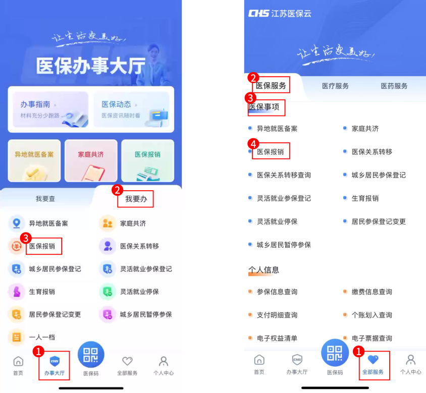 您可以打开“江苏医保云”APP,点击【办事大厅】→【我要办】,找到【医保报销】,或者点击【全部服务】→【医保服务】,在【医保事项】里找到【医保报销】,点击进入即可。