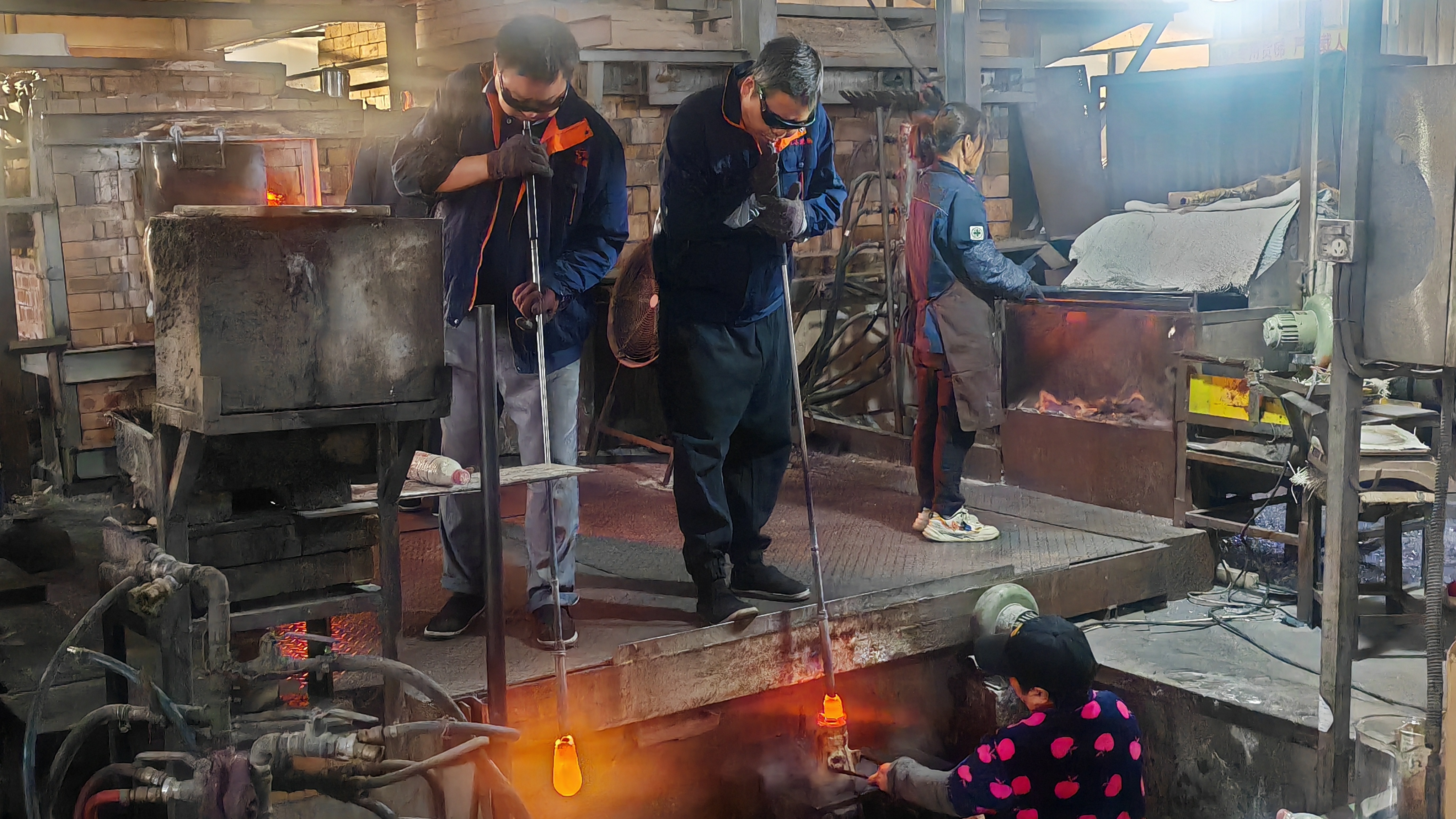 不一会儿,冯凯就将挑好料的不锈钢管递给旁边的吹制师傅冯小军。冯小军戴着墨镜和手套,将不锈钢管举到嘴边,深吸一口气,鼓起腮帮子用力吹向管内,同时不停地匀速转动吹管,气息均匀地被送入玻璃液内部。橘红色的球体缓缓膨胀,透出琥珀般的光泽。旋转、塑型、冷却……5分钟后,一个完美的玻璃球壳呈现在工作台上。
