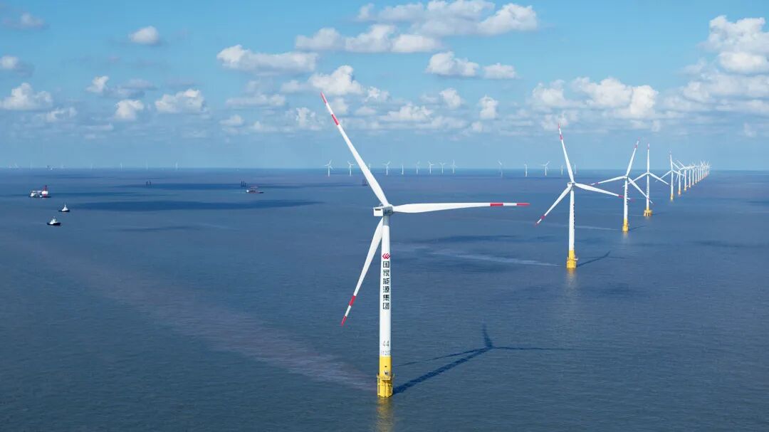 在黄海中部,距东台海岸线37公里的海面上,125台白色风机巍然耸立,巨大的叶片迎风匀速旋转,与波涛共舞,这里就是国华东台海上风电项目现场。