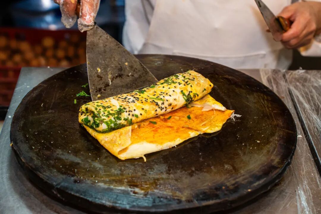这绝非普通的煎饼,师傅的手腕灵巧地一转,一个完美的圆便在鏊子上诞生。紧接着,磕开鸡蛋,蛋液如碎金般泼洒,迅速与面饼融为一体。