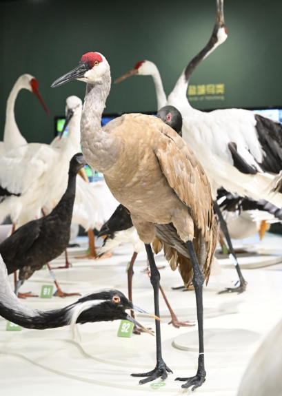 沙丘鹤体型中等 ,通体呈灰棕色 ,前额有鲜艳的红色裸皮 ,脸颊为白色 ,叫声独特而富有穿透力 。
