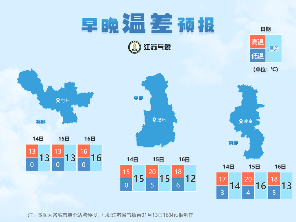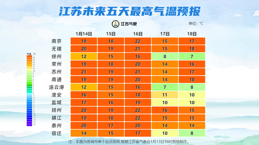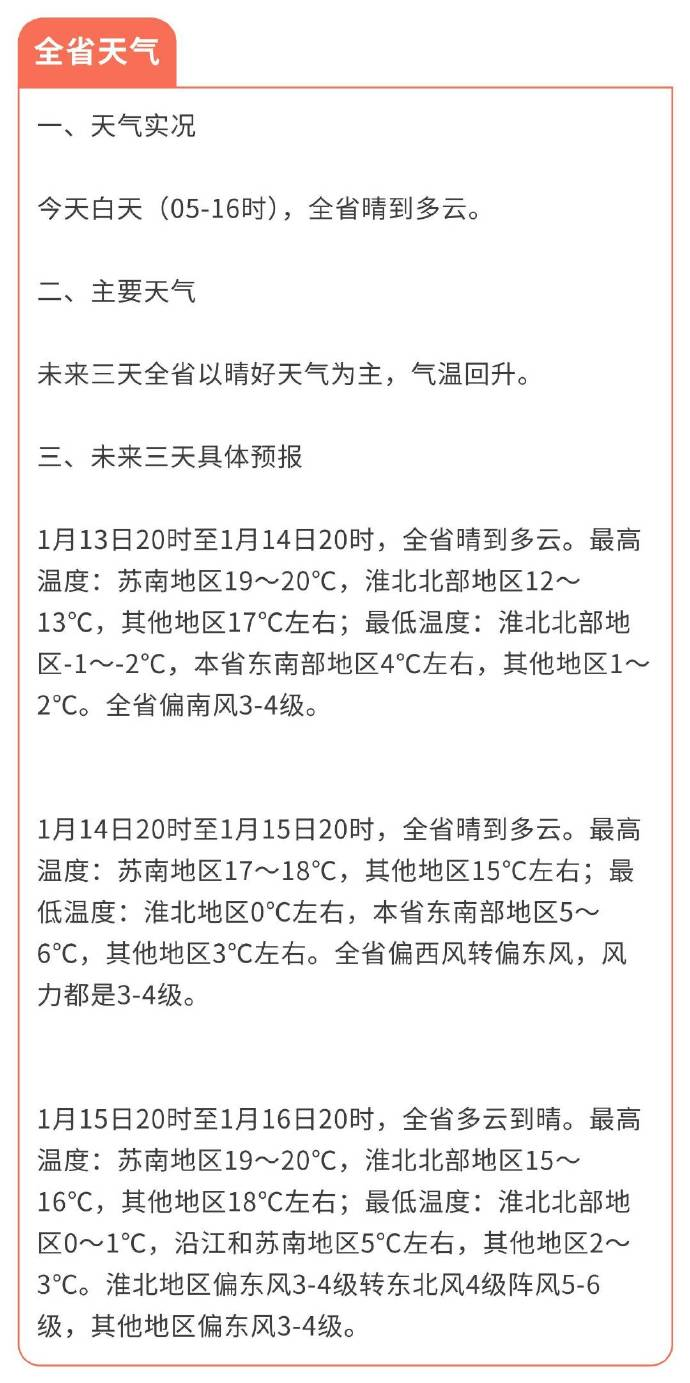 1月13日20时至1月14日20时,全省晴到多云。最高温度:苏南地区19~20℃,淮北北部地区12~13℃,其他地区17℃左右;最低温度:淮北北部地区-1~-2℃,本省东南部地区4℃左右,其他地区1~2℃。全省偏南风3-4级。