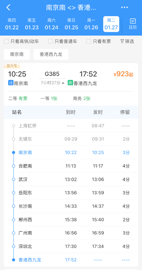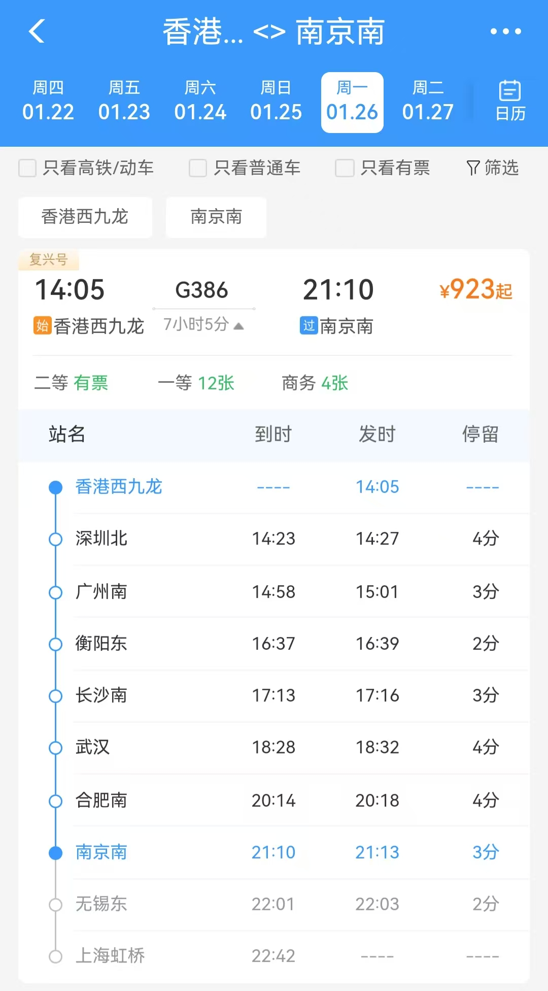 1月26日,高铁香港段将开通G386次列车往来香港西九龙站至上海虹桥站,经停南京南站和无锡东站,返程G385次高铁,10点25分出发从南京南站出发,直达香港西九龙站,仅需7小时27分。